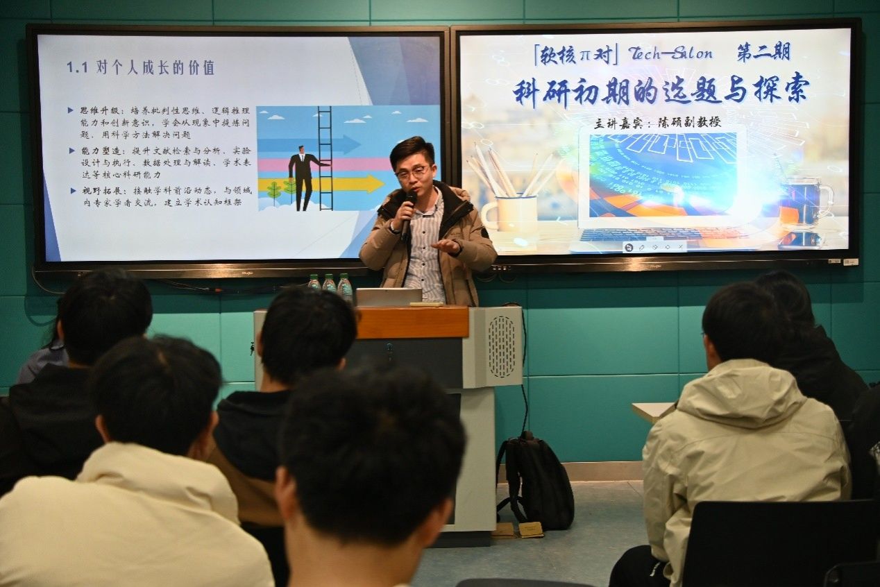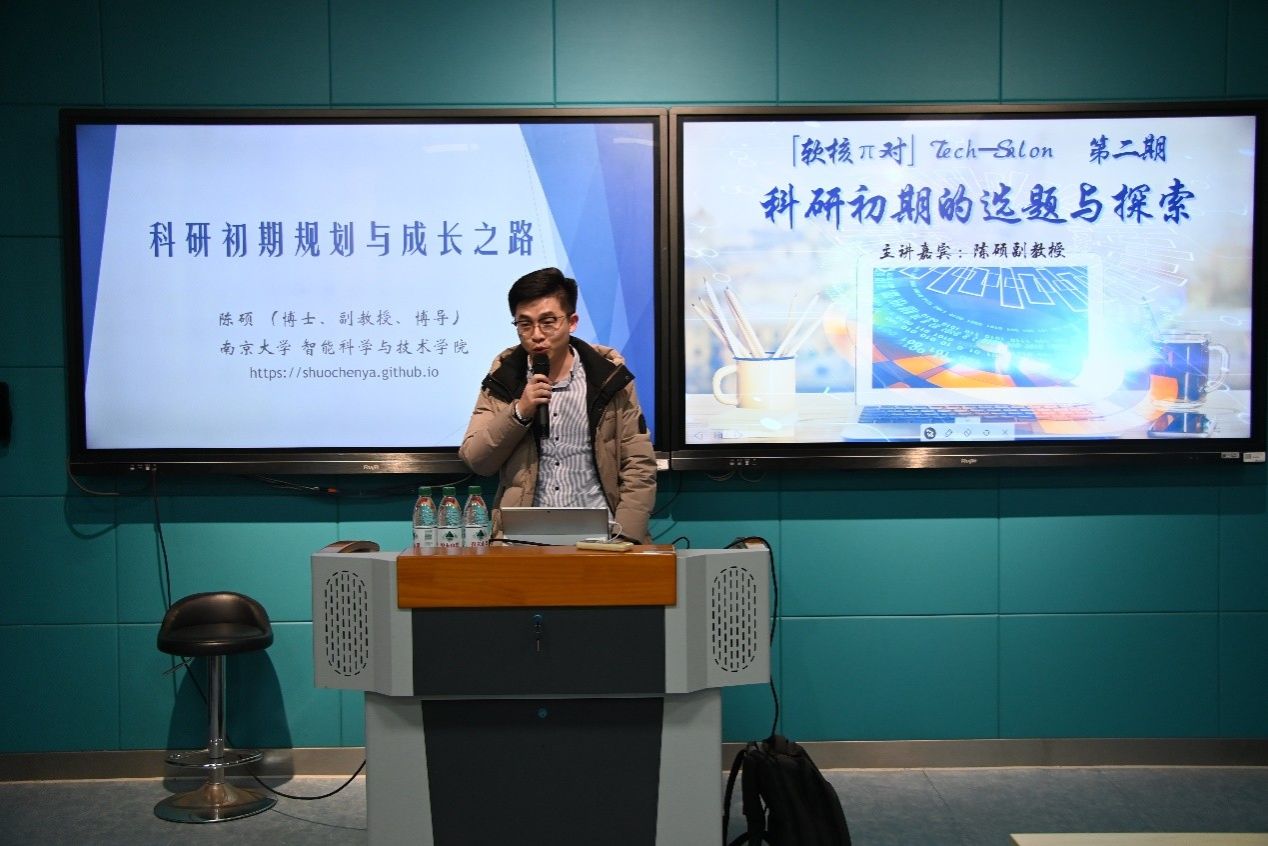 12月9日下午,软件学院在科技楼2-226举办了「软核π对」技术沙龙第二期。我校知名校友、南京大学智能科学与技术学院副教授、博士生导师、姑苏青年教授陈硕应邀主讲,以《科研初期的选题与探索:从入门到创新的启航指南》为题,为研究生及部分本科生带来一场系统全面的科研入门指导。