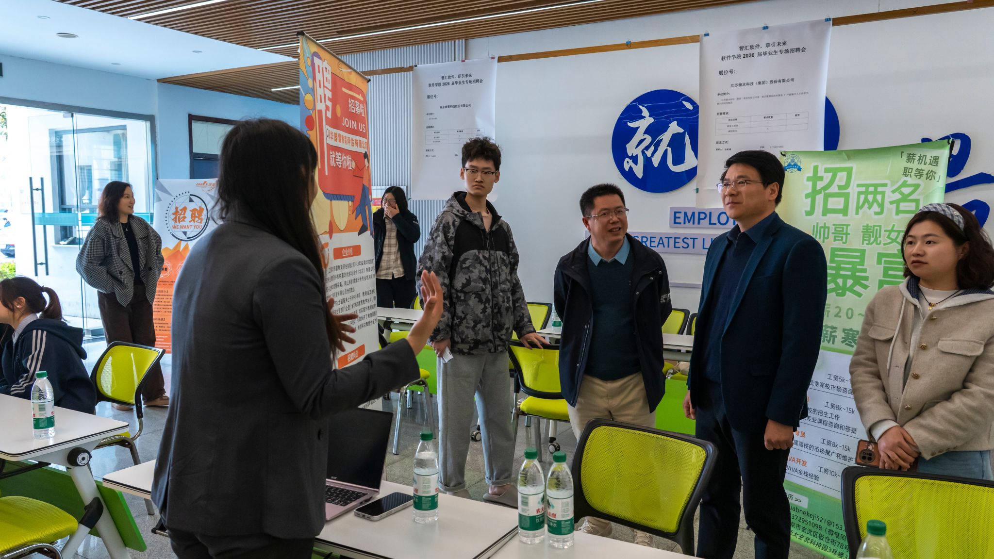 现场氛围热烈,各企业通过宣传物料展示招聘信息,岗位涵盖软件开发、项目实施、大数据等,适配性强。重点岗位包括Unity开发工程师、软件开发工程师等,同时面向2027届本科生推出多个实习岗位。企业工作人员耐心解答疑问,与求职学生双向沟通。