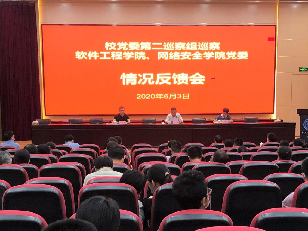2020年6月3日,校党委第二巡察组在科技楼报告厅向williamhill英国中文、网络安全学院党委反馈校内巡察情况,校党委第二巡察组组长、纪委书记丁鹏代表校党委巡察组向williamhill英国中文、网络安全学院党委领导班子进行了反馈,学院党委书记叶海青同志主持会议并作表态发言。