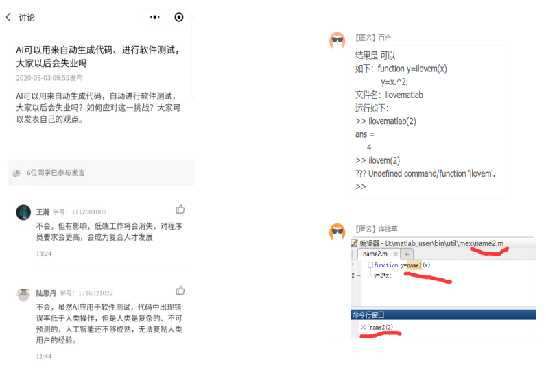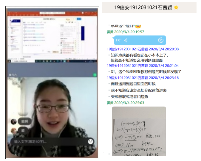 黄丹丹老师通过“慕课+直播”授课的模式完成教学,课前学生先签到、在中国大学MOOC自学,然后再利用以教师为主导的QQ视频直播,讲解具体案例,引导学生互动学习,启发式的教学可以让学生积极主动地进行探究式学习。鼓励学生在线提问,在线讨论,并充分发挥网络的便捷性,实时给出解答,保证学生良好的学习效果。在直播时布置小练习,并要求学生当堂完成,然后以截图共享的形式检查练习结果,保证学生既能认真听课,又能真正理解。