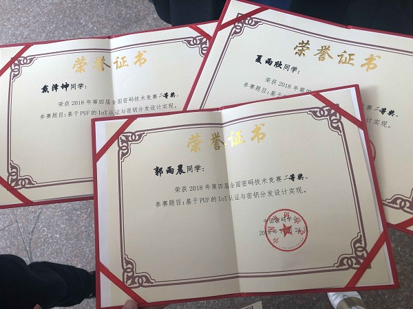 2018年11月23日,第四届全国密码技术竞赛总决赛在杭州电子科技大学成功举办。大赛由中国密码学会主办,国家密码管理局进行指导,中国密码学会教育与科普工作委员会、卫士通信息产业股份有限公司、得安信息技术有限公司、北京鼎九信息工程研究院有限公司、杭州电子科技大学共同承办,天津灵创智恒软件技术有限公司提供技术支持。我院0x36团队以作品“基于PUF的IoT认证与密钥分发设计实现”获决赛二等奖。