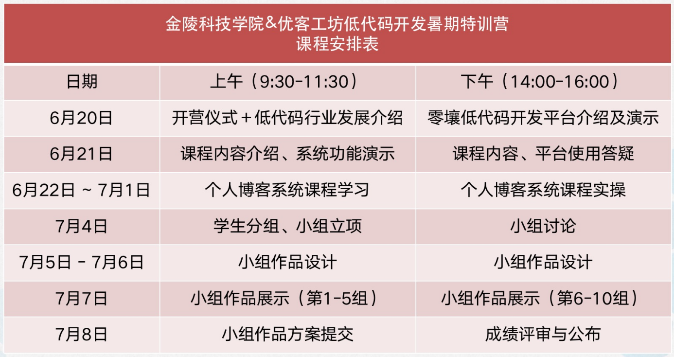 本期暑期实训为期三周,实训紧张而充实,内容涵盖低代码平台介绍和使用、个人博客系统实战、小组合作项目成果展示汇报等,旨在带领学生了解低代码开发领域,培养学生低代码开发实践及创新能力,实训安排如下: