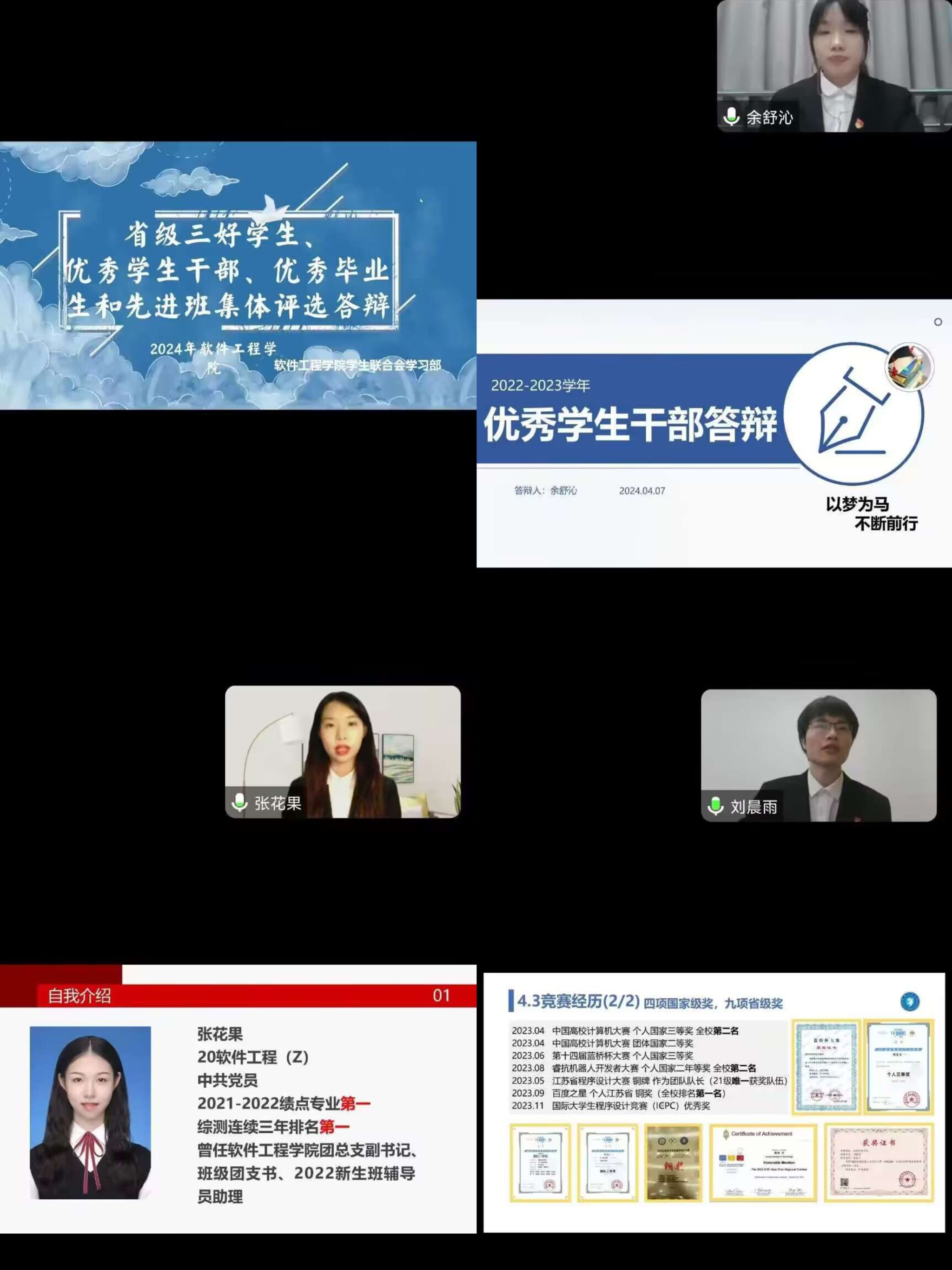 评审会上,在省级三好学生、优秀学生干部、优秀毕业生的评选陈述环节,各候选人通过PPT展示他们在思想品德、学习成效、科研竞赛、社会实践、志愿服务和学生工作等方面的突出表现和丰硕成果。有的同学专业能力突出,成绩名列前茅;有的同学工作能力突出,担任学院、班级主要学生干部,提升学生组织活力,服务同学;有的同学综合表现突出,积极参与实践活动,发扬先锋模范作用;也有的同学注重知行结合,课内成绩优异的同时,积极投身社会实践和学科竞赛,在各方面都取得了突出成绩和亮眼表现。各候选人在陈述过程中情绪饱满,自信从容,将自己的成长、收获与感悟娓娓道来,表现优异。在省级先进班集体的评选陈述中,参评班级代表分别从思想引领、班级建设、学习成果、生活服务、特色活动等方面进行了充分的展示,展现出班级团结向上的班风班貌。
