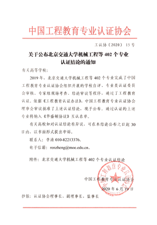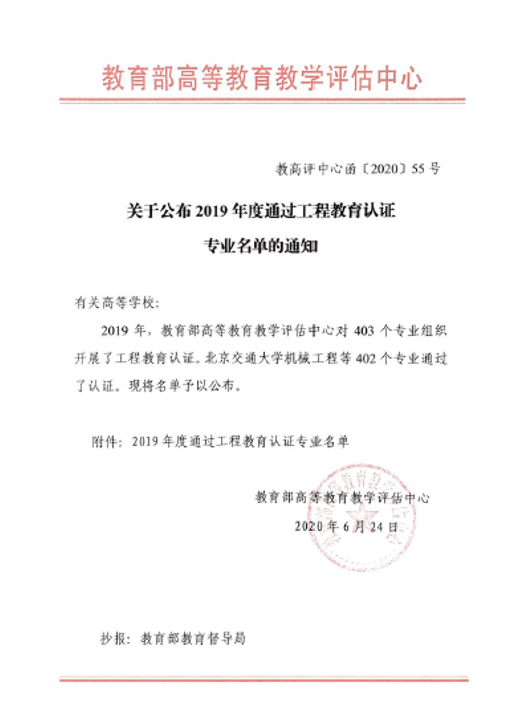 近日,教育部高等教育教学评估中心、中国工程教育专业认证协会正式发布《关于公布2019年度通过工程教育认证专业名单的通知》(教高平中心函[2020]55号)和《关于公布北京交通大学机械工程等402个专业认证结论的通知》(工认协[2020]15号),公布了2019年度通过工程教育认证专业名单。我校软件工程专业顺利通过工程教育专业认证,成为该专业通过认证的首批应用型高校。