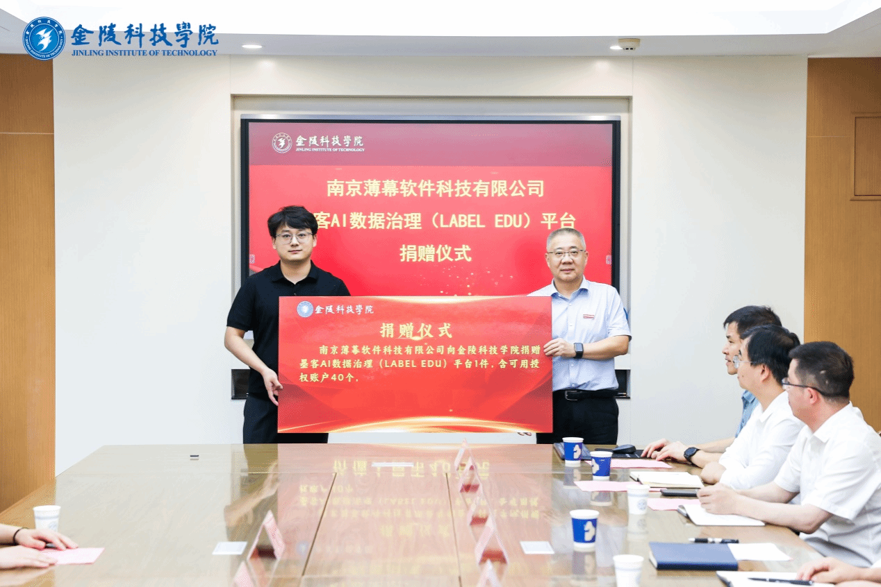 6月21日,williamhill英国中文在行政楼240会议室举行了校友企业南京薄幕软件科技有限公司向母校捐赠“墨客AI数据治理(LABEL EDU)平台”仪式。校党委书记刘志远,党委常委、副校长高永祥出席了捐赠活动,南京薄幕软件科技有限公司总经理任远东(2015级校友)、执行技术总监李海洋(2015级校友)、校友办负责人、软件学院领导班子成员和师生代表参加了活动。