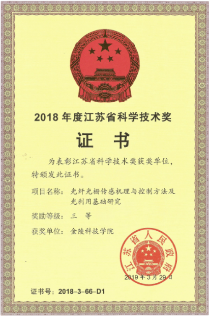胡兴柳、杨忠,光纤光栅传感机理与控制方法及光利用基础研究,江苏省科学技术奖, 三等奖,2018