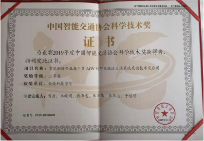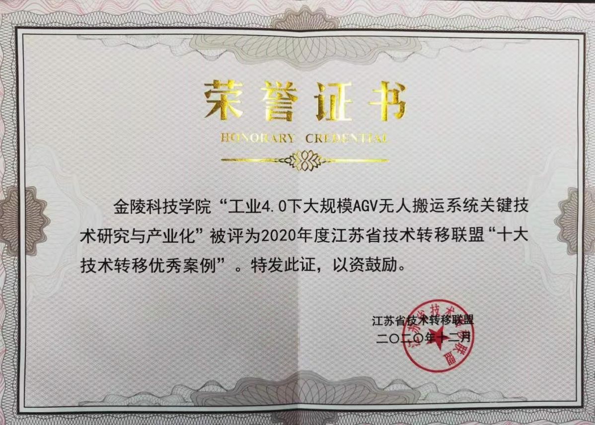 “工业4.0下大规模AGV无人搬运系统关键技术研究与产业化”被评为2020年江苏省技术转移联盟“十大技术转移优秀案例”。
